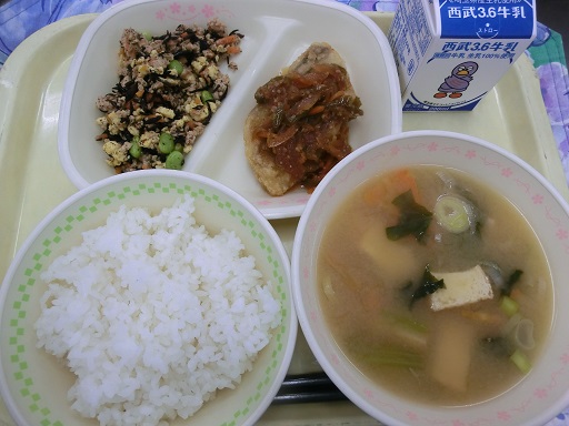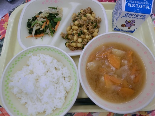 「みそポテト」は秩父地方の郷土料理で、深谷市の給食でもたびたび紹介しています。「ほうれん草とひじきのサラダ」もツナが入ってほうれん草をたくさん食べることができます。