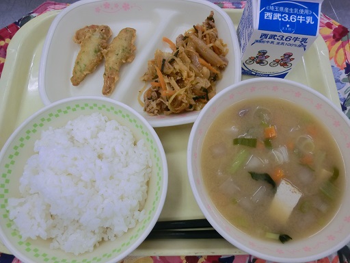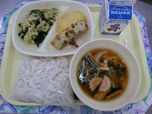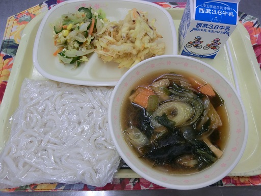 きょうは肉うどんと2種類の天ぷらの献立です。まだまだ暑い日が続いていますが、旬のおいしい食べ物を味わうことで少しずつ