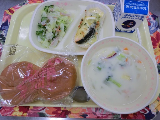 主菜は「さけのマヨネーズ焼き」です。魚の値段が高くなって給食では「鮭」も高級な食材になっています。調理員さんが手間をかけて丁寧に焼き上げてくれました。魚料理でしたがほとんど残らなかったです。