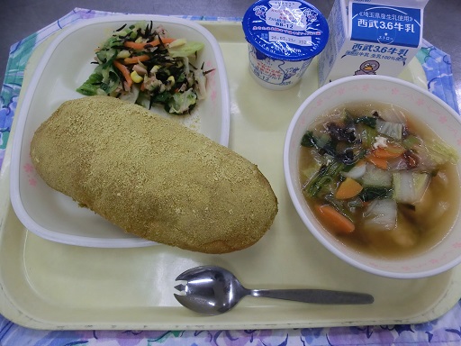 修学旅行の時に食べられなくて残念だった人がいたということで「抹茶入りきな粉揚げパン」を実施しました。