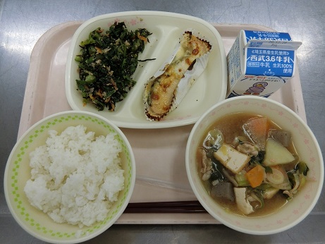 ごはん・鮭のマヨネーズ焼き・深谷産!ほうれん草のサラダ・豚汁・牛乳