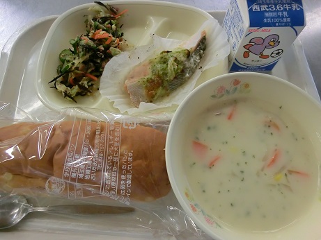 きょうは、 パインパン・牛乳・サーモンソティガーリックバター風味・ クリームシチュー・ツナとひじきのサラダでした。 鮭は1年中給食の献立に登場します。塩焼き・フライ・みそ マヨネーズ焼きなどがよく出ます。 きょうは、ムニエル風にしてにんにくとチーズと高価なバターを 少し加えてオーブンで焼きました。 エネルギー 852 kcal たんぱく質 32.8g 脂質 27.2g 塩分 4.5g