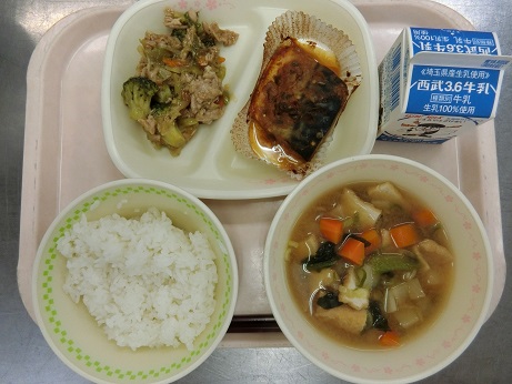 きょうの献立は ごはん・さばのねぎみそ焼き・豚肉とブロッコリーのオイスター炒め・ 野菜椀・牛乳です。