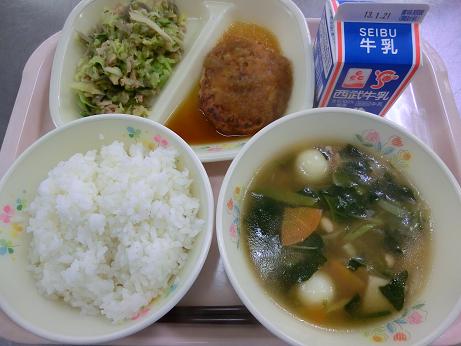 きょうは、 ごはん・牛乳・和風おろしハンバーグ・雑煮・ヘルシー サラダでした。 きょうは、鏡開きでした。1年の健康や安全を願ってお正月 に供えた鏡もちを食べる日で、給食では白玉もちが入った 雑煮を出しました。 |