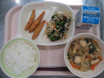 きょうの献立は うま煮丼・わかさぎフライ・切り干し大根の和え物・牛乳です。 エネルギー 834 kcal たんぱく質 33.0g 脂 質 24.4g 食塩相当量 3.0g