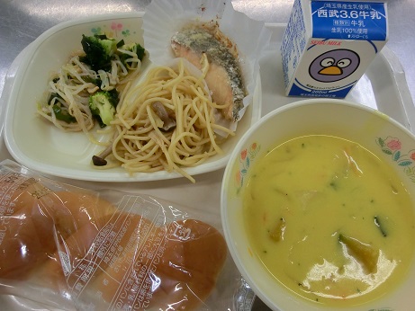 ・ツイストパン・牛乳・鮭のムニエル・温野菜・きのこ