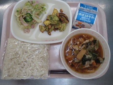 五目うどん・青のりポテトビーンズ・たくあんサラダ・牛乳