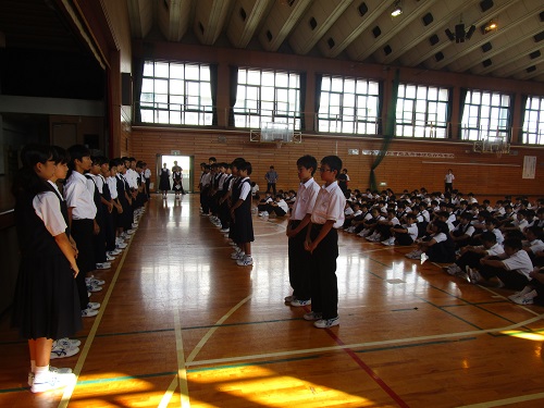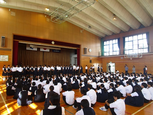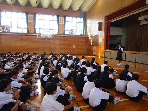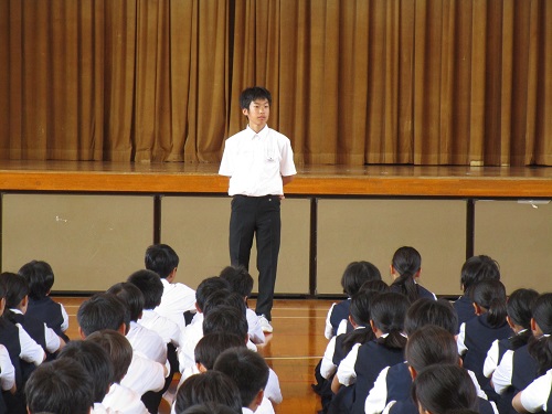 1年生の学年集会が行われ、体育祭実行委員や学級委員が、体育祭の振り返り、感想や思いを発表しました。1年生全員でお互いの頑張りを称え合うことができました。