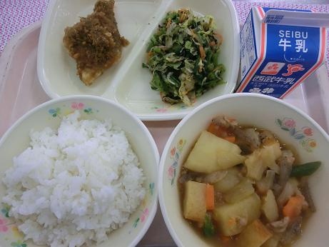 きょうは、 ごはん・牛乳・白身魚の南蛮漬け・肉じゃが・ 磯の薫あえでした。 磯の香あえは、カルシウムを多く摂取できるよう、小松菜 ちりめんじゃこ・のりがたっぷり入っています。 |