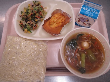 きょうの献立は もやしラーメン・オレンジパンケーキ・ツナとひじきのサラダ・ 牛乳です。 エネルギー 819 kcal たんぱく質 28.6g 脂 質 20.2g 食塩相当量 3.8g