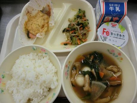 きょうは、 ごはん・牛乳・鮭のピリ辛マヨネーズ焼き 野菜の中華炒め・だんご汁・ヨーグルトでした。 「鮭のピリ辛マヨネーズ焼き」は、鮭にマヨネーズ・粉チーズ トウバンジャン・ごまをのせて焼きました。 塩焼きとはまた別な味が楽しめます。だんご汁はだしの香り がよく、白玉だんごが入っていてあっさりとした汁物です。 |