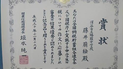 平成30年度中学生の「税についての作文」関東信越国税局長賞を 1年生藤井萠絵さんが受賞しました。