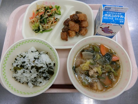 きょうの献立は わかめごはん・豚肉と高野豆腐のごまだれ・ちゃんこスープ・ からしあえ・牛乳です。