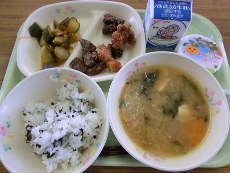 わかめごはん・牛乳・豚肉とレバーのごまだれ