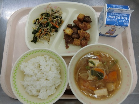 ごはん・豚肉と高野豆腐の香味揚げ・磯の香あえ・みそ汁・牛乳