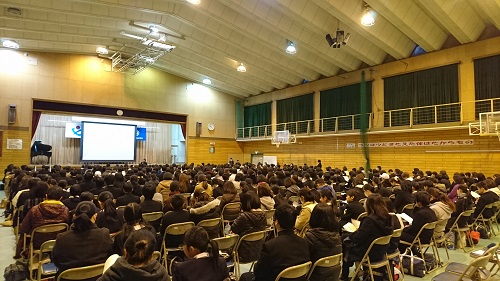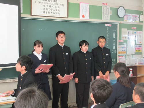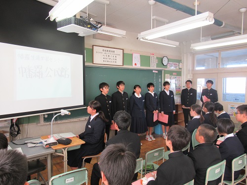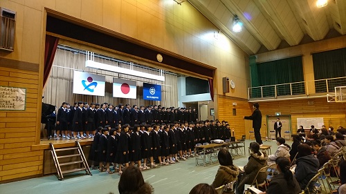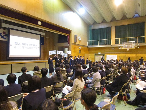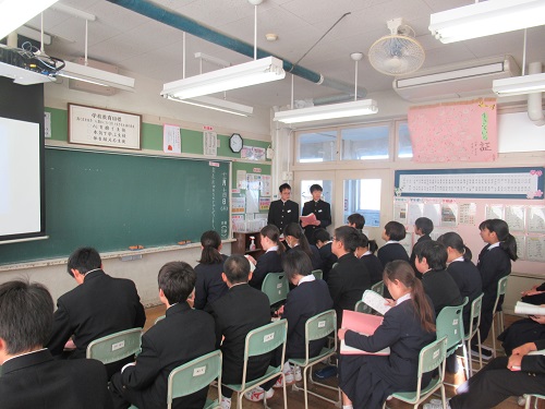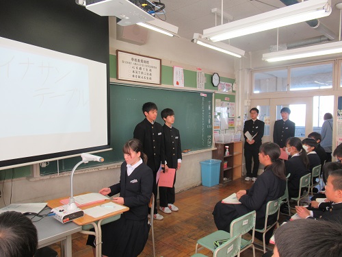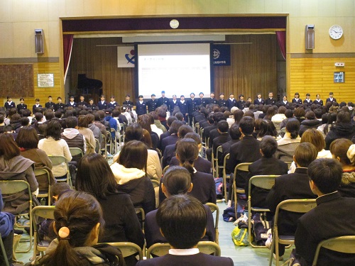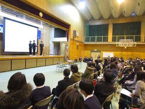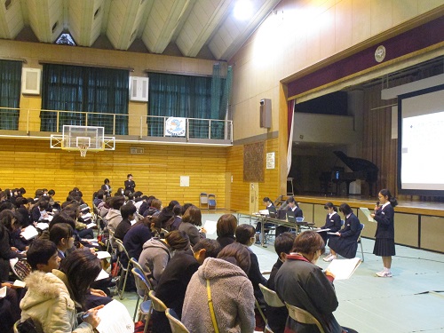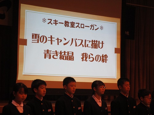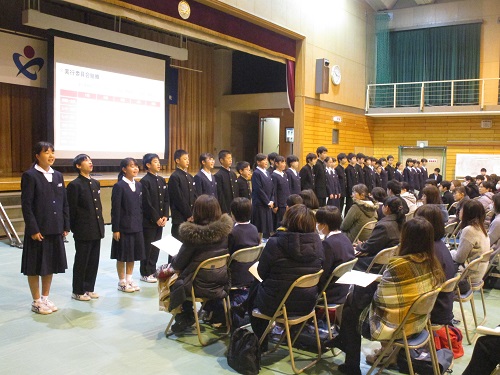 3年生は各教科の授業、2年生は社会体験チャレンジのレポート等の発表、1年生はスキー教室の説明会を、実行委員の生徒によるパワーポイントや演技によるプレゼンテーションを大いに取り入れて行いました。説明会の最初には音楽会の学年合唱曲「FACE」を学年生徒全員で披露しました。