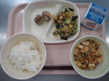 きょうの献立は ごはん・麻婆豆腐・しゅうまい・海藻サラダ・牛乳です。 エネルギー 821 kcal たんぱく質 31.1g 脂 質 29.1g 食塩相当量 3.5g