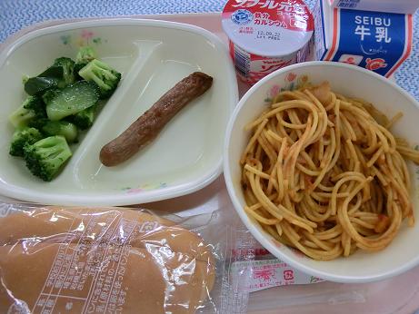 きょうは、 コッペパンスライス・牛乳・トンノスパゲッティ・ウィンナー グリーンサラダ・ヨーグルトでした。 トンノスパゲッティはツナが入ったスパゲッティです。 パンにウィンナーをはさんで食べる献立で、パンはいつもより 小さめのサイズです。 |