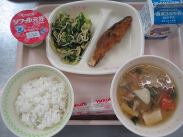 ごはん・ぶりのおろしソースかけ・からしあえ・豚汁・