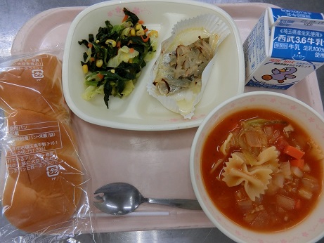 ツイストパン・鱈のアヒージョ風・ほうれん草とコーンのソテー・ミネストローネ・