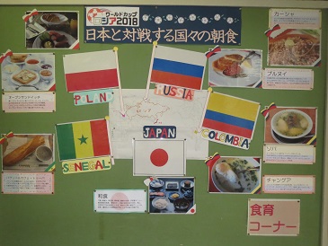 食育コーナーの掲示も ワールドカップで、日本と対戦する国々の朝食に