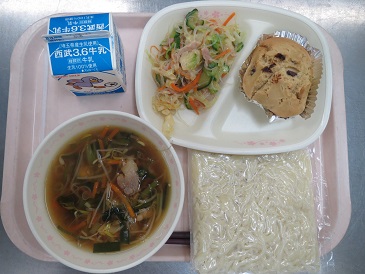 きょうの献立は 広東めん・黒糖パンケーキ・春雨サラダ・牛乳です。 エネルギー 856 kcal たんぱく質 28.9g 脂 質 19.2g 食塩相当量 4.0g
