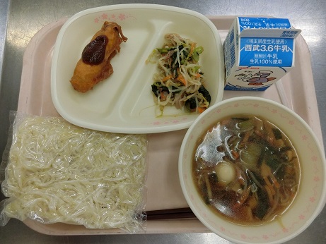 きょうの献立は 広東めん・アメリカンドッグ・小松菜の中華サラダ・牛乳です。