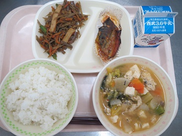 きょうの献立は ごはん・さばのねぎみそ焼き・きんぴら・キムチ鍋スープ・牛乳です。 エネルギー 817 kcal たんぱく質 35.4g 脂 質 23.9g 食塩相当量 3.4g