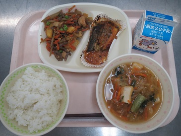 きょうの献立は ごはん・さばねぎみそ焼き・じゃがいものきんぴら・ 大根のみそ汁・牛乳です。 エネルギー 827kcal たんぱく質 33.3g 脂 質 24.7g 食塩相当量 3.1g