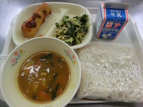 カレーうどん・牛乳・アメリカンドッグ・和風サラダ