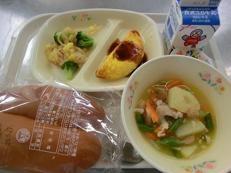 黒パン・牛乳・チーズオムレツ・じゃがいもの洋風煮・