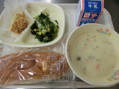 パインパン・牛乳・チキン香味焼き・ほうれん草と