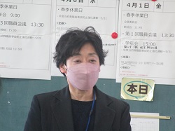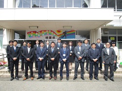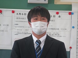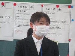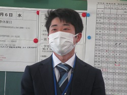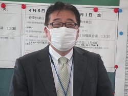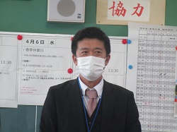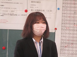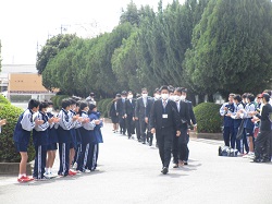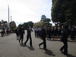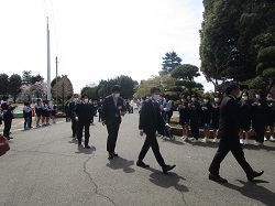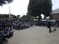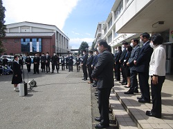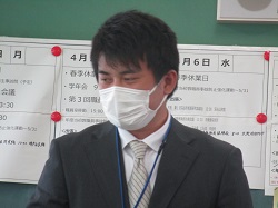 転入職員の入場を部活動中の生徒が拍手で迎えた後、生徒会長が歓迎の言葉を述べ、学校紹介をしました。それに応えて転入職員を代表して教頭が挨拶と抱負を述べました。