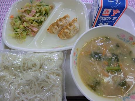きょうは、 ごまみそラーメン・牛乳・焼ぎょうざ・春雨サラダ でした。 今週は給食週間で、給食の時間に1年生の作文を紹介 しています。「いただきます」の意味や感謝して食べる気持ち を表現してあり、とてもよく読んでくれています。 |