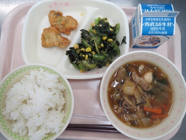 きょうの献立は 旨煮丼・あじフリッター・小松菜サラダ・牛乳です。 エネルギー 827kcal たんぱく質 34.3g 脂 質 28.3g 食塩相当量 2.8g