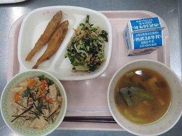 きょうの献立は たけのこごはん・ししゃもフライ・春キャベツのサラダ・なめこ汁・牛乳です。 エネルギー 819 kcal たんぱく質 33.3g 脂 質 28.6g 食塩相当量 4.9g