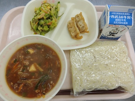 麻婆ラーメン・揚げぎょうざ・海藻サラダ・牛乳です。