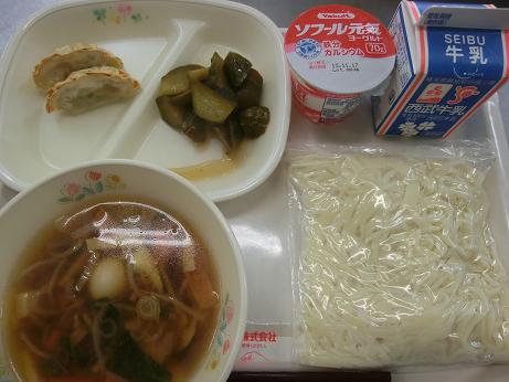きょうは、 広東めん・牛乳・焼き餃子・きゅうりのピリット漬け ヨーグルトでした。ヨーグルトには、牛乳に匹敵する栄養価が あり、タンパク質やカルシウムの利用性も高いです。 また、ヨーグルトの乳酸菌はビタミンをつくる腸内細菌を増殖 促進して便通をよくするのに役立ちます。 |