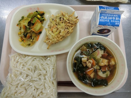 五目うどん・カミカミかき揚げ・小松菜とじゃこの炒り煮・牛乳です。