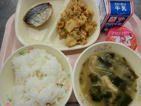 きょうは、 ごはん・牛乳・あじの塩焼き・あさりのみそ汁 新じゃがのそぼろ煮・アセロラゼリーでした。 「じゃがいものそぼろ煮」は、豚肉・にんじん・たまねぎ ・たけのこ・しいたけをみじん切りにしてじゃがいもを加えて 煮ました。 |
