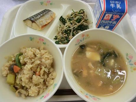 秋の香ごはん・牛乳・鯖の塩焼き・ほうれん草の