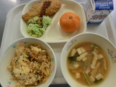 きょうは、 キムタクご飯・牛乳・鮭フライ・せんきゃべつ・ 豆腐のみそ汁・みかんでした。 エネルギー 778kcal たんぱく質 31.9g 脂質 21.2g 塩分 4.9g キムタクごはんは、キムチとたくあんを豚肉と炒めて ごはんに混ぜ合わせます。 歯ごたえがあり、キムチの香りがするごはんです。 |