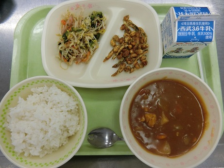 きょうの献立は チキンカレーライス・大豆とごぼうのカリカリ揚げ・もやしのナムル・牛乳です。