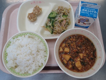 きょうの献立は ごはん・四川風麻婆豆腐・蒸ししゅうまい・もやしのナムル・牛乳です。 エネルギー 837 kcal たんぱく質 30.5 g 脂 質 27.8 g 食塩相当量 3.2 g