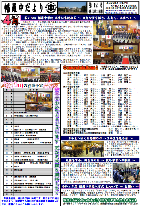 学校だよりをUPしました! 【 今月号の主な内容 】 第75回 幡羅中学校 卒業証書授与式 ~ 大きな夢を抱き,志高く,未来へ! ~ Congratulations! 3年生へ伝える感謝の心 ~ 三年生を送る会 ~ 友情を育み,絆を深める ~ 校外学習への取り組み ~ 令和4年度 幡羅中学校 入学式について ~ お願い ~ 4月の行事予定 家庭の「安心ふっかネット」(深谷市PTA連合会提言) 学校だよりは,上記の「お知らせ」の中にあります「学校だより4月・第12号」を クリックすることで,拡大してご覧いただくことができます。 左上「メニュー」の中にあります「学校だより」からも,拡大版をご覧いただけます |