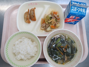 きょうの献立は ごはん・揚げぎょうざ・回鍋肉・中華スープ・ スポーツ牛乳です。