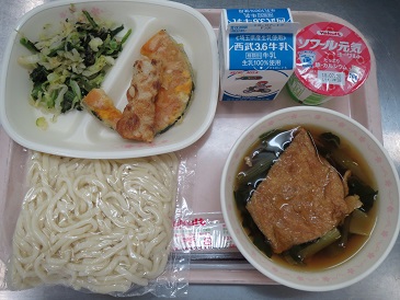 きつねうどん・かぼちゃと竹輪の天ぷら・おひたし・