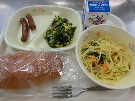 給食では初挑戦のパスタです。オリーブオイルでにんにくと