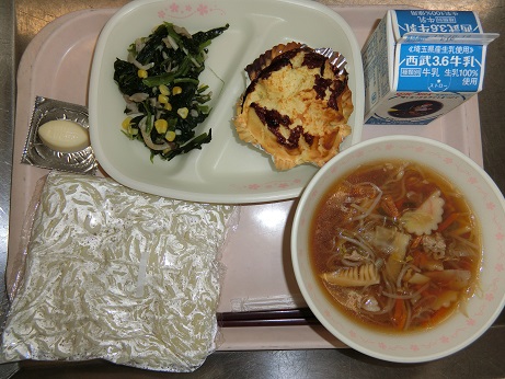 きょうの献立は サンマーメン・ヨーグルトベリーパンケーキ・青菜ときのこのソテー・ ラグビーボールチーズ・牛乳です。