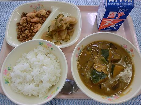 夏野菜カレー・牛乳・大豆のカリカリ揚げ・